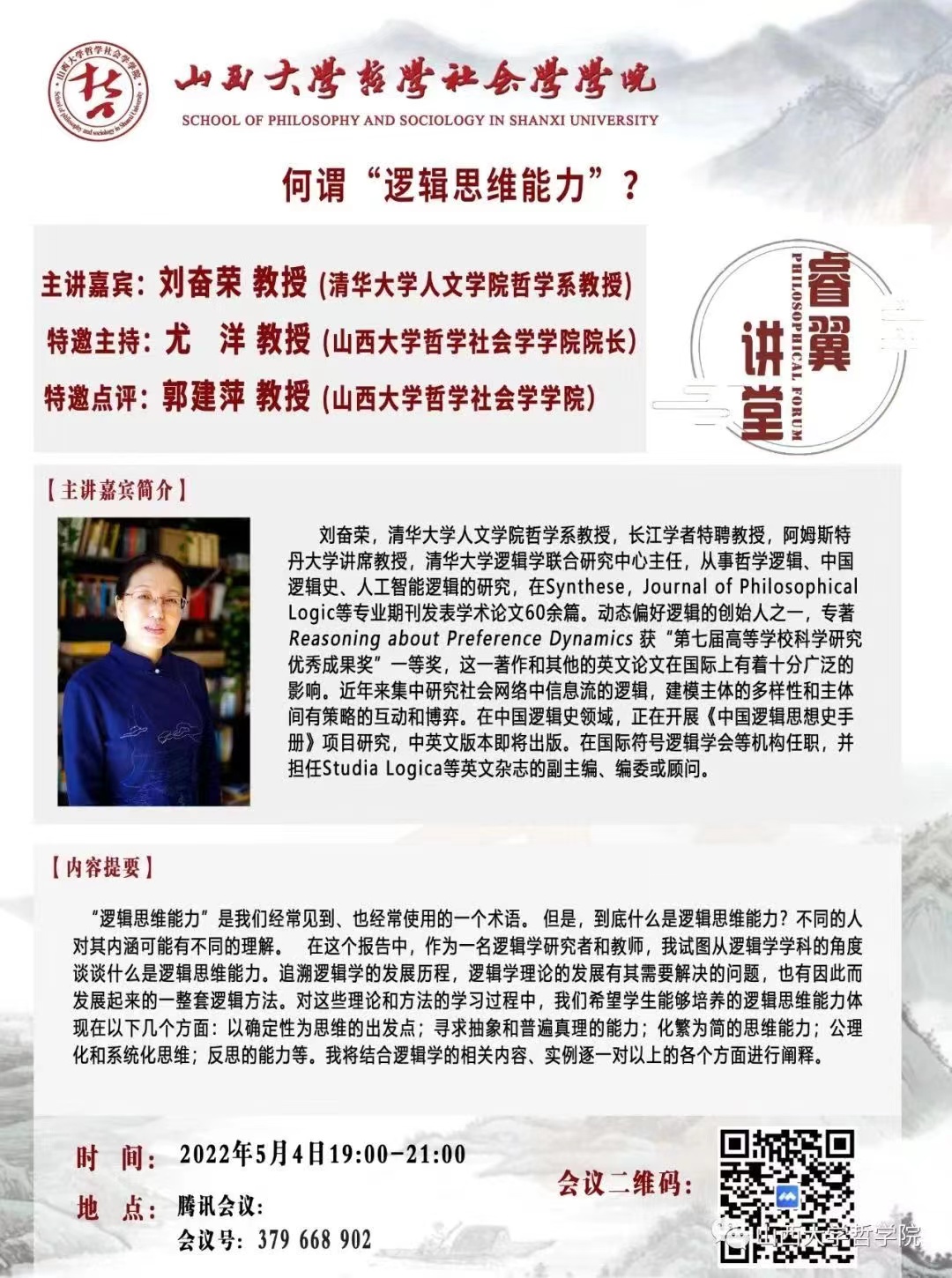 - "What is the Logical Thinking Ability?" Shanxi University, May 4, 2022 (online). Poster.